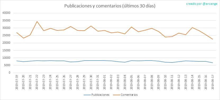 Estos gráficos muestran la evolución de las publicaciones y comentarios por el tiempo de vida útil de la blockchain y durante los últimos 30 días.
