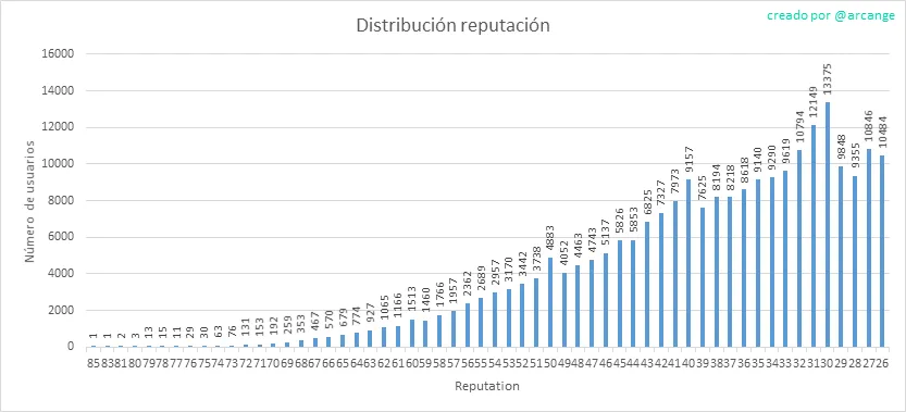Este gráfico muestra la distribución de la reputación entre los usuarios. Las cuentas con una reputación inferior a 25 se han eliminado para mantener el gráfico legible.