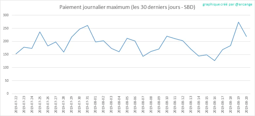 Ces graphiques montrent la récompense maximale payée sur un message (ou un commentaire) pour chaque jour (depuis la création de la blockchain et les 30 derniers jours).