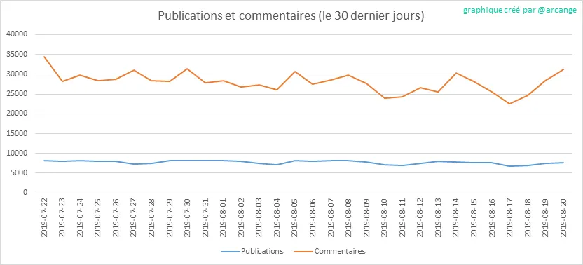 Ces graphiques montrent l'évolution des publications et des commentaires pour toute la durée de vie de la blockchain et pour les 30 derniers jours.