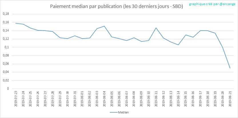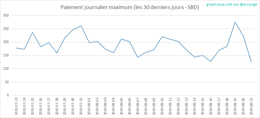 Ces graphiques montrent la récompense maximale payée sur un message (ou un commentaire) pour chaque jour (depuis la création de la blockchain et les 30 derniers jours).