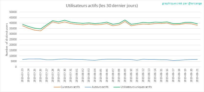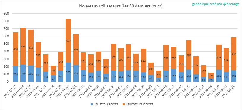 Attention: ce graphique est un peu dynamique! Un utilisateur peut s'inscrire un jour et ne devenir actif que quelques jours plus tard. Par conséquent, le nombre d'utilisateurs actifs à une date donnée peut varier d'un jour à l'autre.