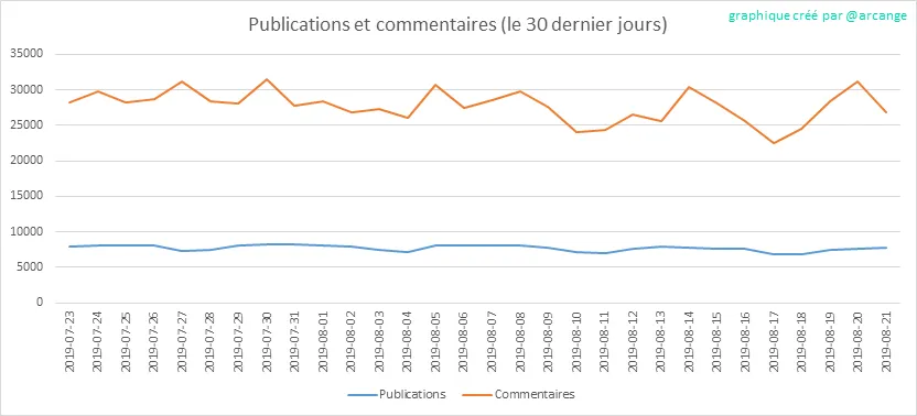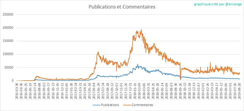 Ces graphiques montrent l'évolution des publications et des commentaires pour toute la durée de vie de la blockchain et pour les 30 derniers jours.