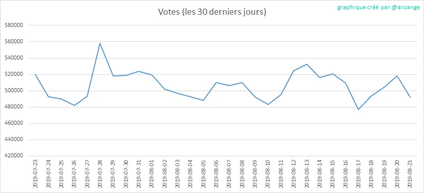 Ces graphiques montrent l'évolution de la curation (votes positifs) depuis la création de la blockchain et pour les 30 derniers jours.