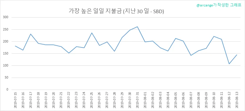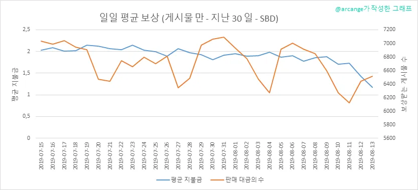 위의 그래프들은 지난 30일간 게시글당 평균 보상 금액과 중앙값(median payout)을 보여줍니다.