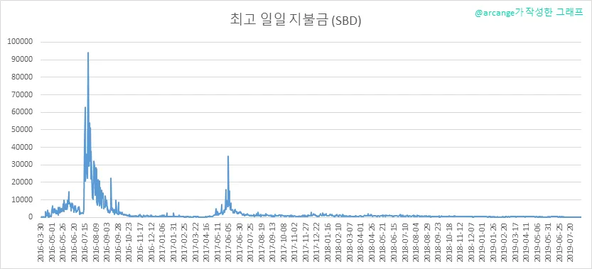 위의 그래프들은 1일간 최대 보상을 받은 포스트 (또는 댓글)의 금액을 보여줍니다 (블록체인 전체 기간과 지난 30일 간).