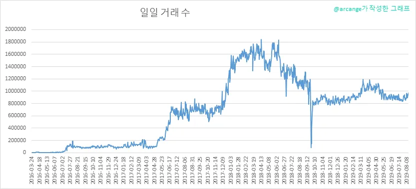 위의 그래프는 일간 트랜잭션 수를 보여줍니다. 이 그래프를 통해 블록체인의 전체 활동에 대한 아이디어를 얻을 수 있습니다.