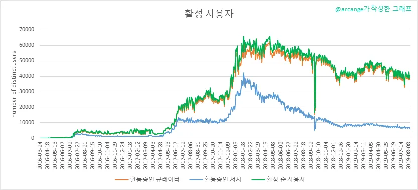 녹색선은 그 중 얼마나 많은 계정이 한번이라도 활성화 되었는지 나타냅니다. (활성화는 단 한번이라도 글, 댓글 또는 업보트를 한 계정을 말합니다.) 그들은 그들이 나중에 비활성화 될 경우에도 포함되어 있습니다.