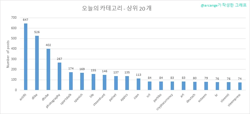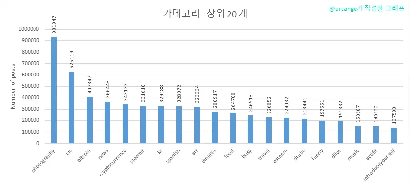 이 그래프는 전체 기간 중 상위 20개 카테고리의 게시글 숫자를 보여줍니다.