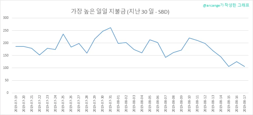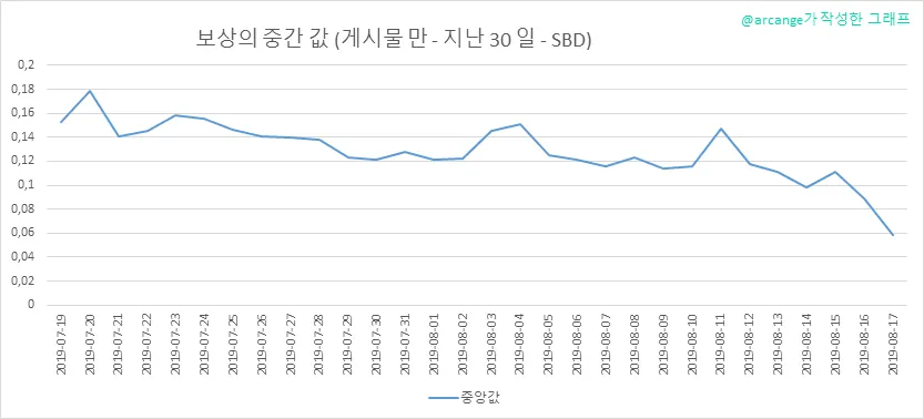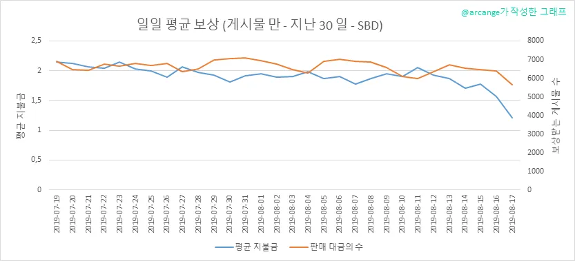 위의 그래프들은 지난 30일간 게시글당 평균 보상 금액과 중앙값(median payout)을 보여줍니다.