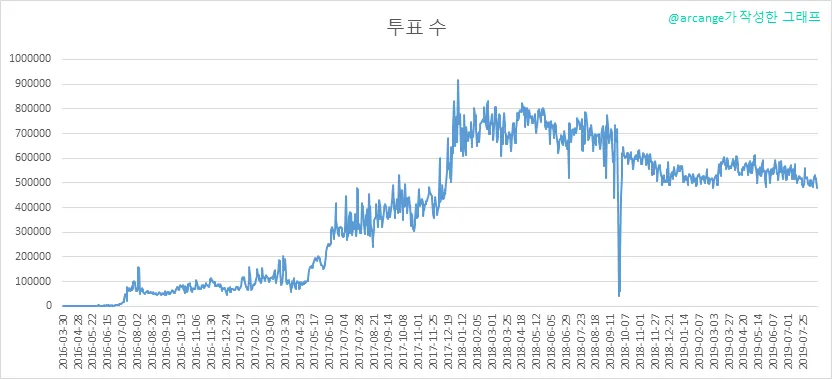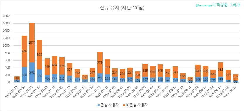 이 그래프는 스팀잇에 새로 가입한 유저 숫자와 그 중에서 얼마나 활성화가 되었는지 알려줍니다. 많은 유저들이 가입은 하지만, 실제로 사용되지는 않는다는 걸 볼 수 있습니다.