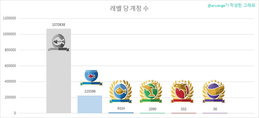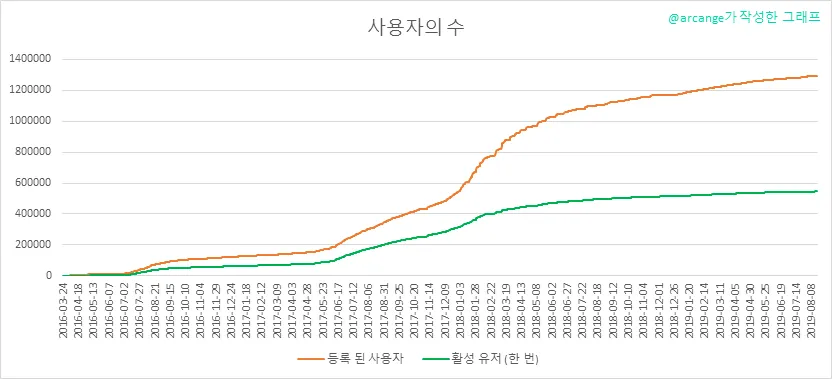 이 그래프에서 주황선은 전체 가입한 계정의 수를 보여줍니다.