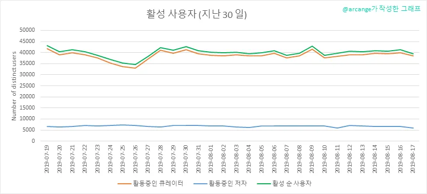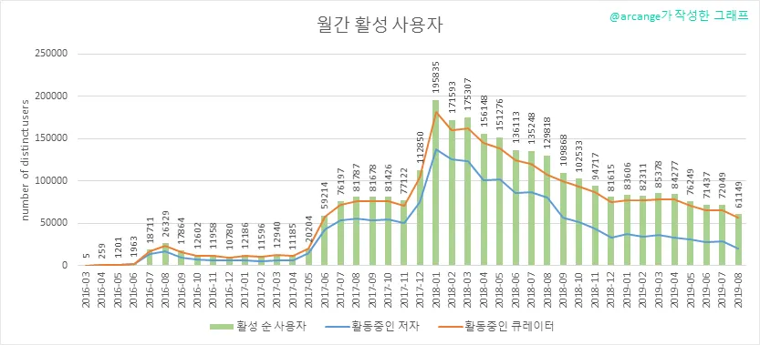 녹색선은 그 중 얼마나 많은 계정이 한번이라도 활성화 되었는지 나타냅니다. (활성화는 단 한번이라도 글, 댓글 또는 업보트를 한 계정을 말합니다.) 그들은 그들이 나중에 비활성화 될 경우에도 포함되어 있습니다.