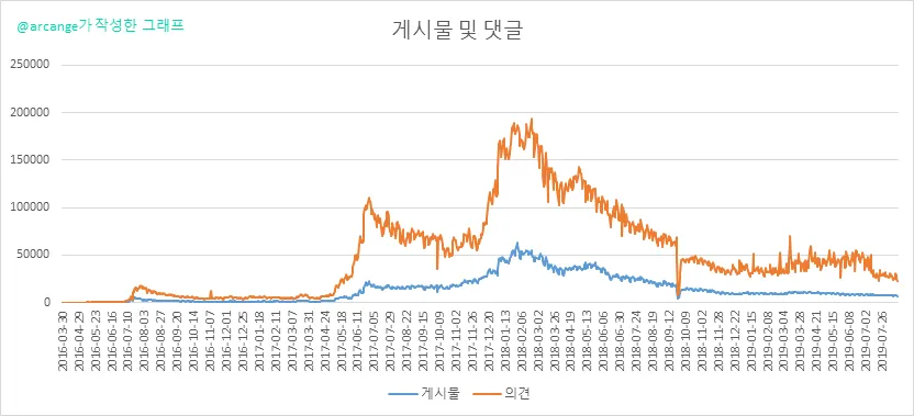 위의 두 개의 그래프는 블록체인 전체 기간과 지난 30일간의 포스트와 댓글 수를 보여줍니다.