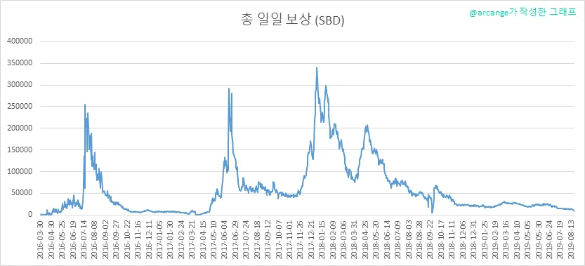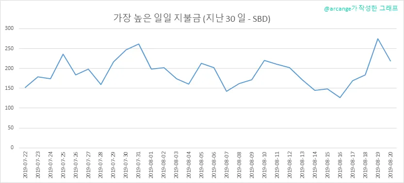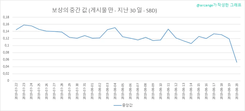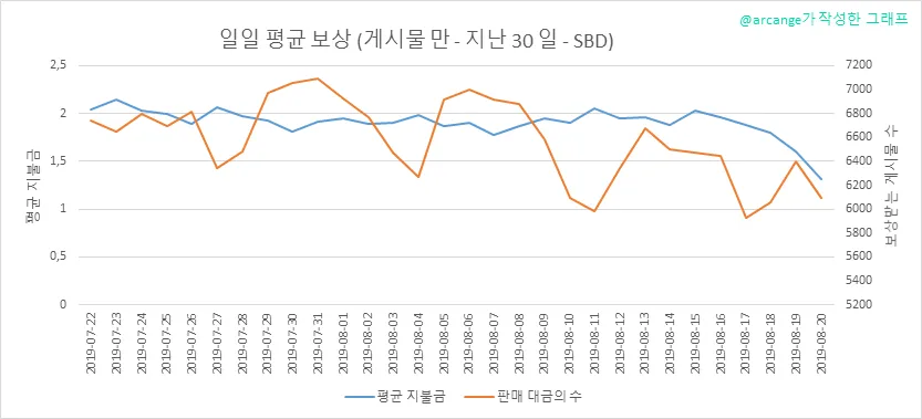 위의 그래프들은 지난 30일간 게시글당 평균 보상 금액과 중앙값(median payout)을 보여줍니다.