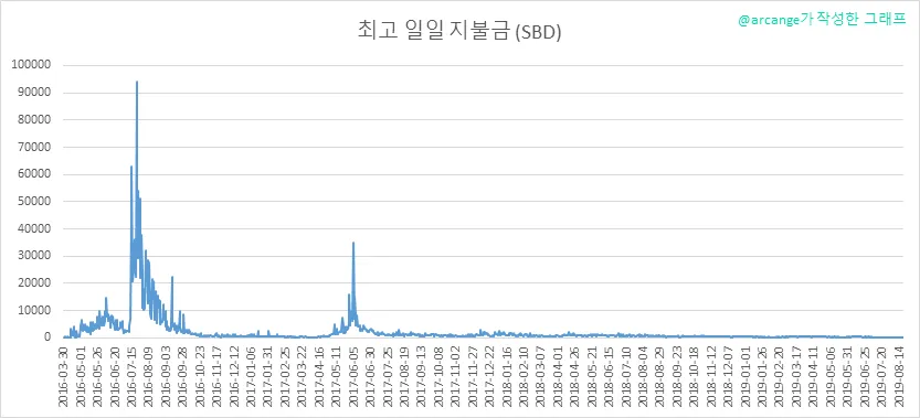 위의 그래프들은 1일간 최대 보상을 받은 포스트 (또는 댓글)의 금액을 보여줍니다 (블록체인 전체 기간과 지난 30일 간).
