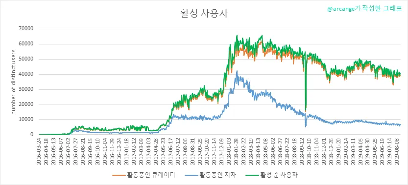 녹색선은 그 중 얼마나 많은 계정이 한번이라도 활성화 되었는지 나타냅니다. (활성화는 단 한번이라도 글, 댓글 또는 업보트를 한 계정을 말합니다.) 그들은 그들이 나중에 비활성화 될 경우에도 포함되어 있습니다.