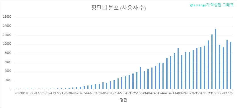 이 그래프는 평판 수치에 따른 유저들의 분포도를 보여줍니다. 25 이하의 평판을 가진 유저들은 그래프에서 제거되었습니다.