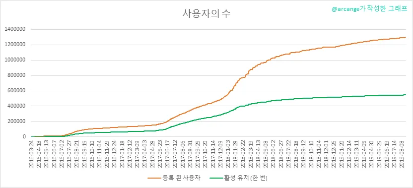이 그래프에서 주황선은 전체 가입한 계정의 수를 보여줍니다.
