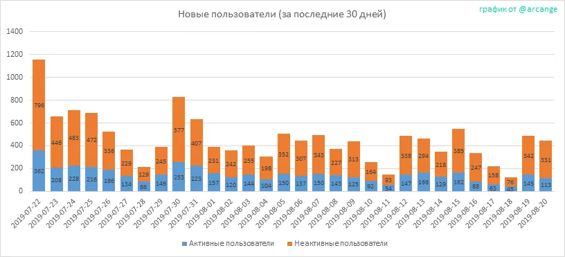 Внимание: этот график является динамическим! Пользователь может зарегистрироваться в один день и стать активным несколько дней спустя. Таким образом, количество активных пользователей за конкретные даты может измениться со дня на день.