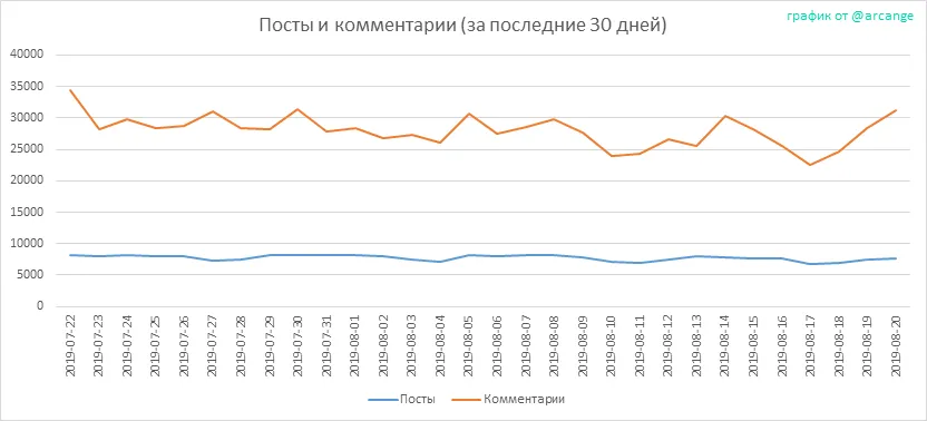 Эти графики показывают изменения количества постов и комментариев, с момента создания и в течение последних 30 дней.