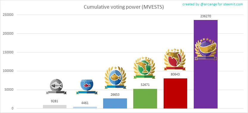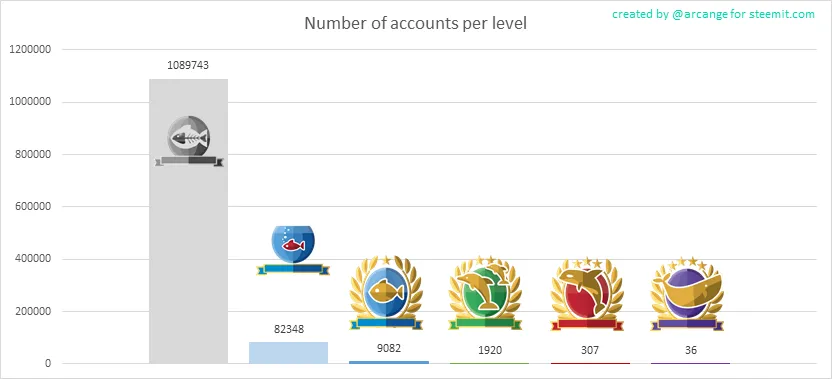 This graph shows the number of users according to their voting power (it now includes the new "Inactive" and "Red Fish" levels - check @steemitboard blog for more info about this).