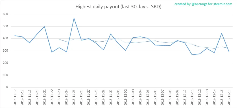 These graphs show the maximum reward paid on a post (or comment) for each day (whole blockchain life and last 30 days).
