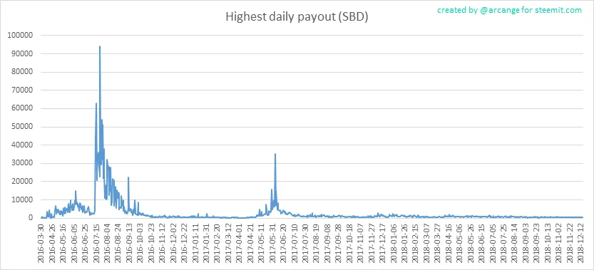 These graphs show the total of the distributed payout (posts and comments) for each day.