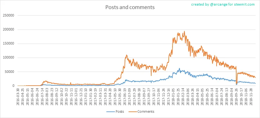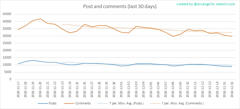 These graphs show the evolution of posts and comments for the whole blockchain lifetime and for the last 30 days.
