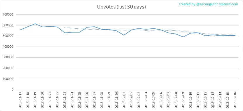 These graphs show the evolution of curation (upvotes) for the whole blockchain lifetime and for the last 30 days.