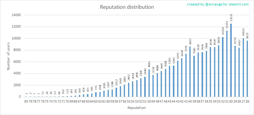 This graph shows the distribution of the reputation among users. Accounts with a reputation lower than 25 have been removed to keep the graph readable.