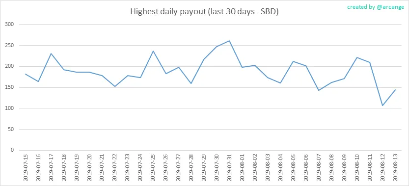 These graphs show the maximum reward paid on a post (or comment) for each day (whole blockchain life and last 30 days).