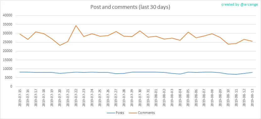 These graphs show the evolution of posts and comments for the whole blockchain lifetime and for the last 30 days.