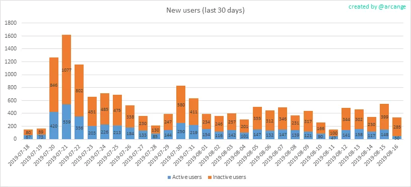 This chart shows the number of newly registered users on the blockchain and how many of them became active. We see that a lot of accounts are registered, but never used.
