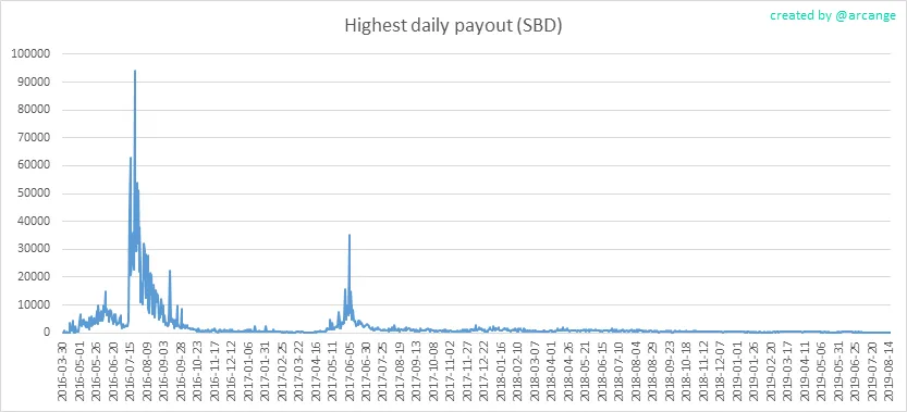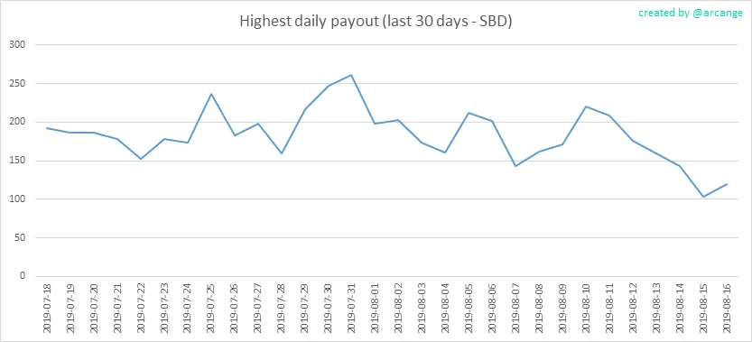 These graphs show the maximum reward paid on a post (or comment) for each day (whole blockchain life and last 30 days).
