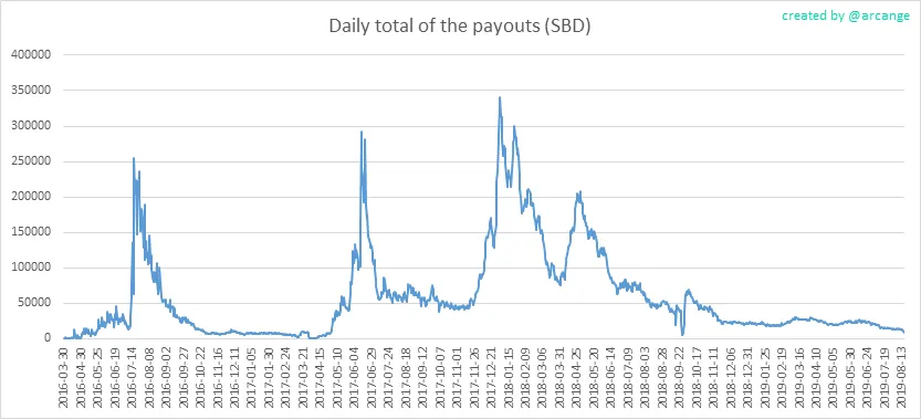 These graphs show the total of the distributed payout (posts and comments) for each day.