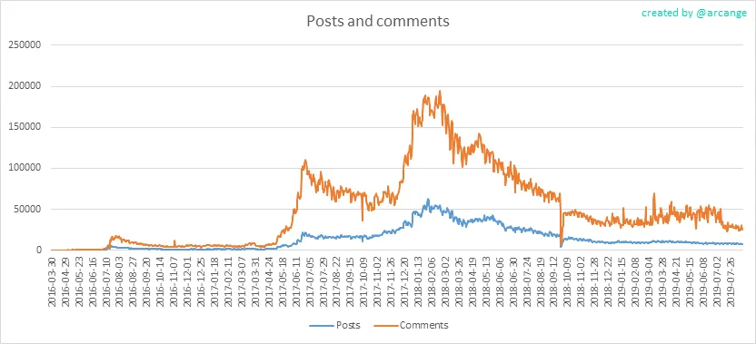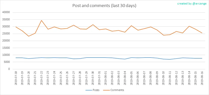 These graphs show the evolution of posts and comments for the whole blockchain lifetime and for the last 30 days.