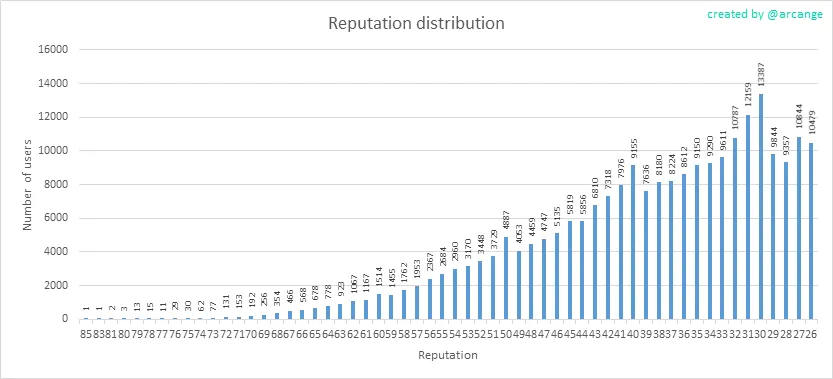 This graph shows the distribution of the reputation among users. Accounts with a reputation lower than 25 have been removed to keep the graph readable.