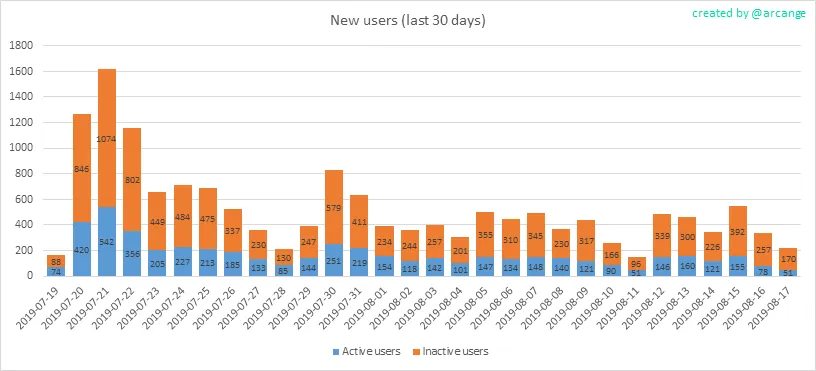 This chart shows the number of newly registered users on the blockchain and how many of them became active. We see that a lot of accounts are registered, but never used.