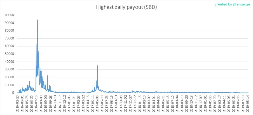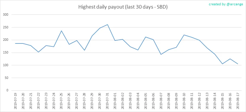 These graphs show the maximum reward paid on a post (or comment) for each day (whole blockchain life and last 30 days).