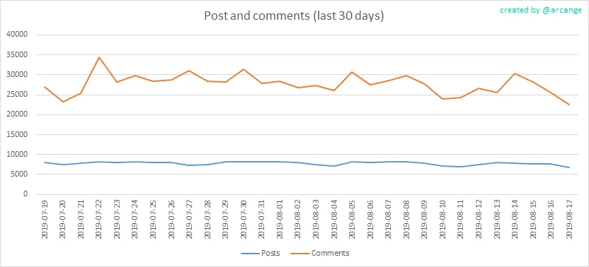 These graphs show the evolution of posts and comments for the whole blockchain lifetime and for the last 30 days.