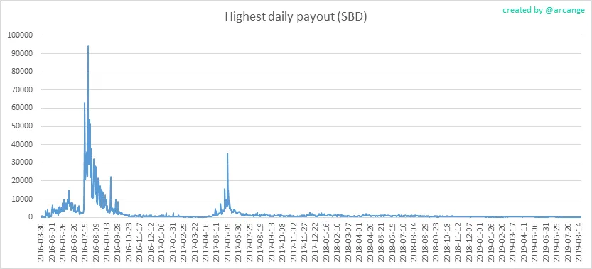 These graphs show the maximum reward paid on a post (or comment) for each day (whole blockchain life and last 30 days).
