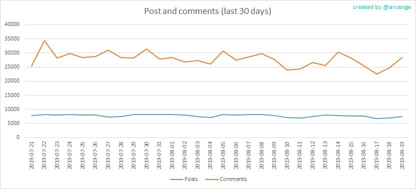 These graphs show the evolution of posts and comments for the whole blockchain lifetime and for the last 30 days.