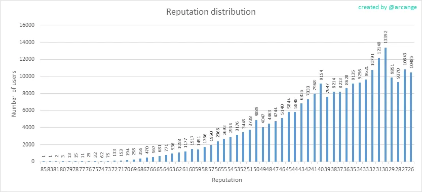 This graph shows the distribution of the reputation among users. Accounts with a reputation lower than 25 have been removed to keep the graph readable.