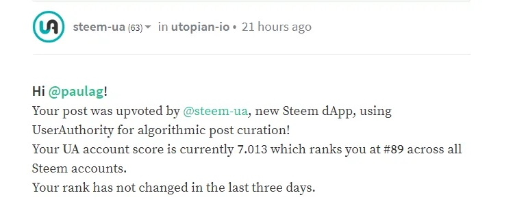 2. Reach a STEEM reputation of 70.  To many this does not mean much.  Lets face it, Rep is easily purchases with the buying of votes and bidbots have really nailed that one down.  But I have not been a bidbot user and my rep of 70 has been earned the way it was originally intended.  I think it was 10 days ago I reached this target.  But for those of you not convinced, I also achieved a ranking of 89 with @steem-ua.  Its amazing to be in the top 100 of something 😊.  Target Achieved.