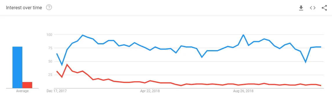 Taken from Google Analytics – Search for Microsoft Excel (blue) v’s STEEM (red) over the last 12 months.