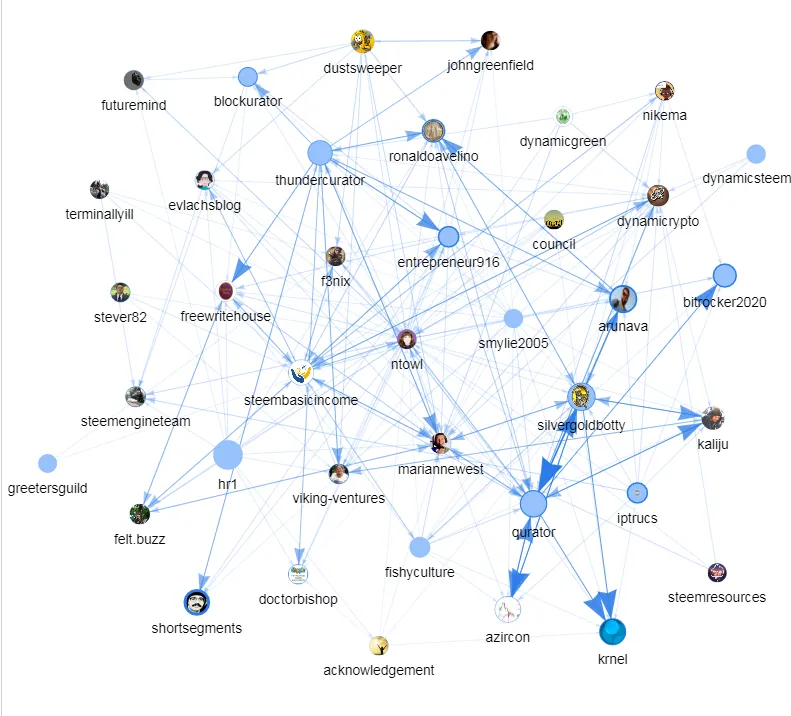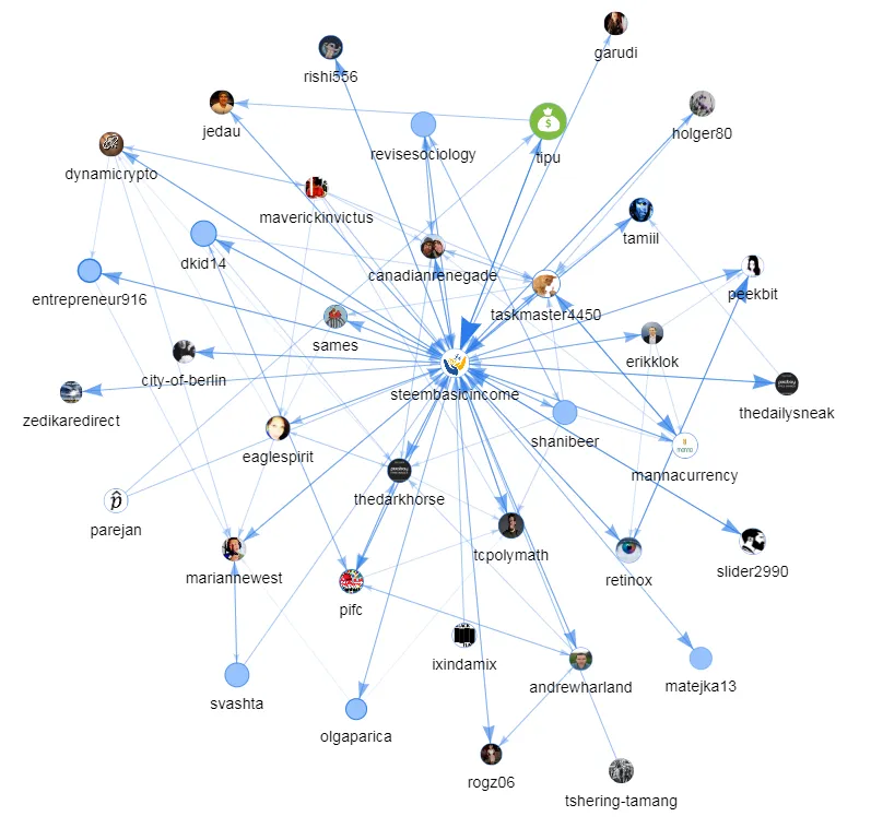 It only shows people that regularly upvote each other or @steembasicincome, but with multiple shares for bigger upvotes. That makes sense, because we have over 3000 active members across eight pools. All of those interrelationships would be too much for this chart.