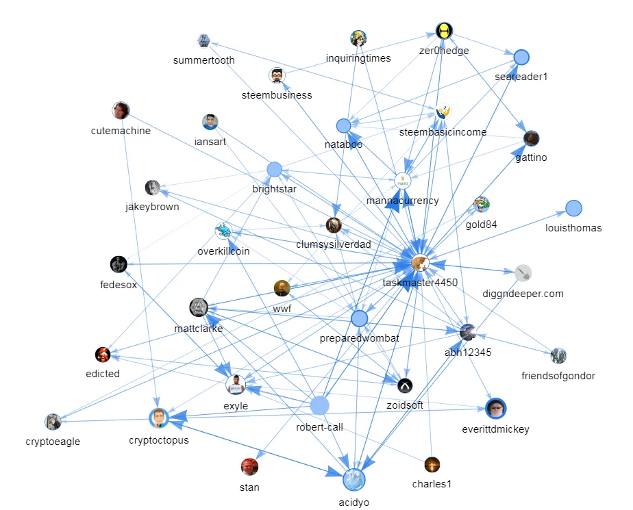 There is solid support from his user base, and a handful of other accounts that I recognize as other thoughtful writers on Steemit, along with some philosophy and information sources like @wwf and @zer0hedge. If you want to be as smart as @taskmaster4450 about all things Steem, follow the accounts he has the biggest arrows going out from!