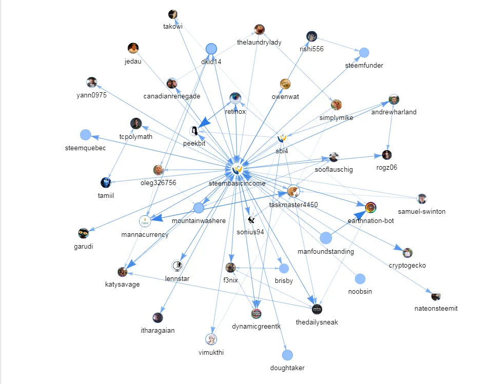 It only shows people that regularly upvote each other or @steembasicincome, that have multiple shares for bigger upvotes. That makes sense, because we have 2300 active members across seven pools. All of those interrelationships would be too much for this chart.