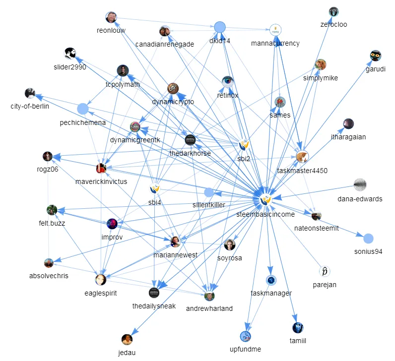 It only shows people that regularly upvote each other or @steembasicincome, but with multiple shares for bigger upvotes. That makes sense, because we have over 3000 active members across seven pools. All of those interrelationships would be too much for this chart.